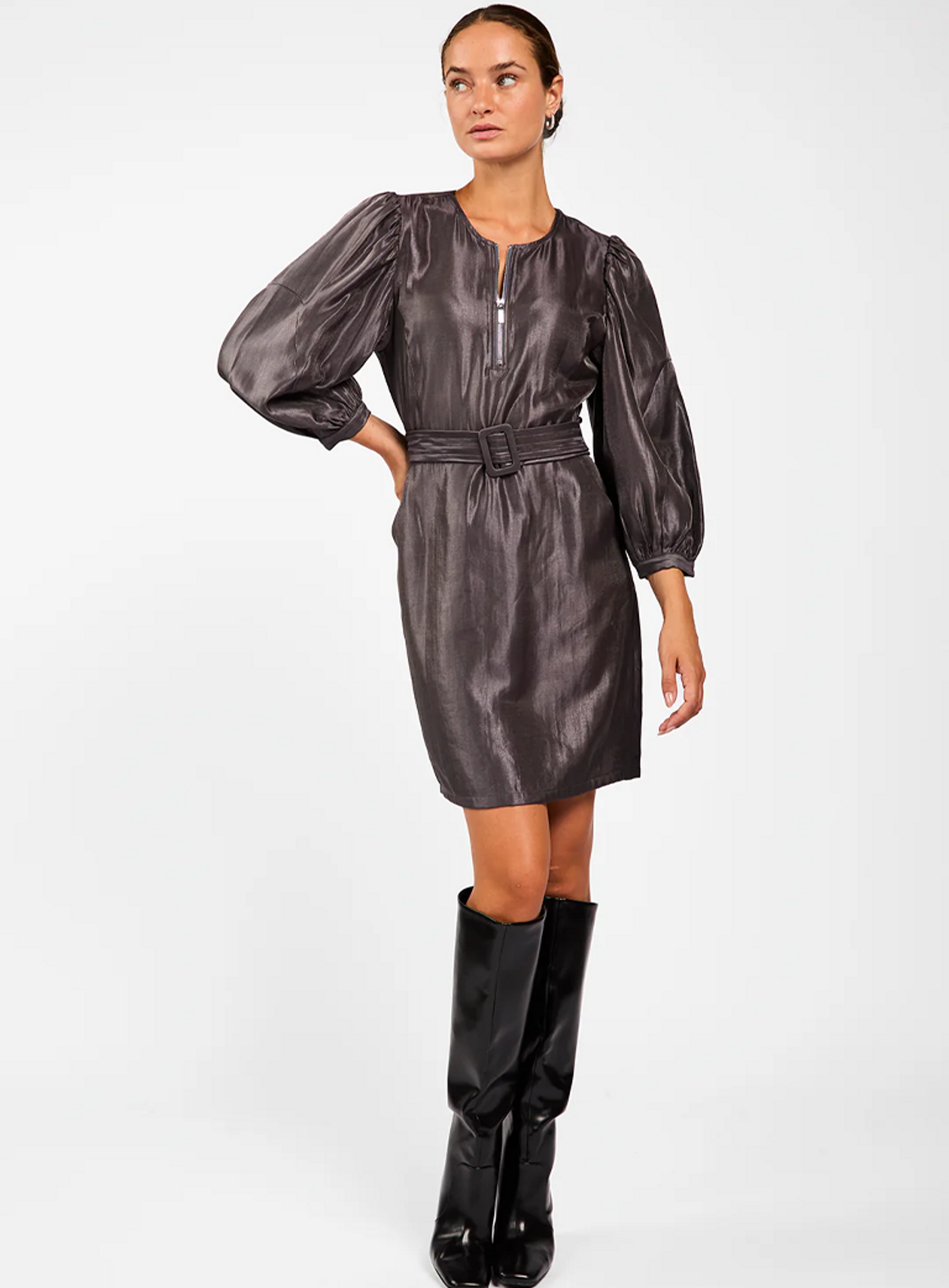 De Semira Jurk van het merk Aaiko is voorzien van lange pofmouwen en een ronde hals die verfijning uitstralen. De rits aan de voorkant bij de hals biedt een modern detail, terwijl de ceintuur riem zorgt voor een betere pasvorm en accentueert je taille. Perfect voor zowel formele als casual gelegenheden, combineert deze jurk comfort en stijl. Een onmisbare toevoeging aan je garderobe.