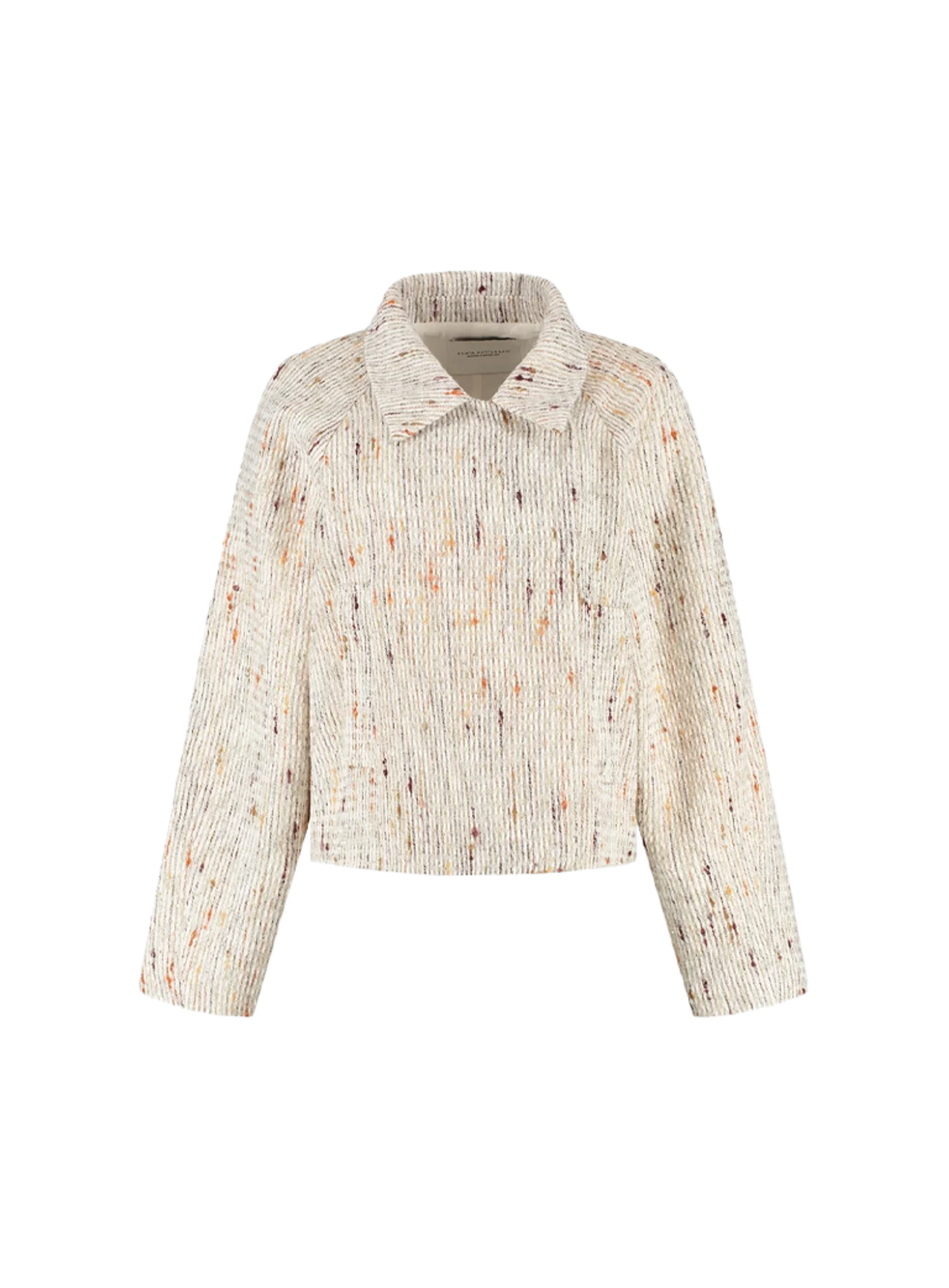 Het Tatum Jacket van het merk Amaya is gemaakt van een luxe, gemêleerde stof met subtiele spikkels in warme tinten zoals oranje en paars. Het jasje heeft een brede kraag, een licht oversized pasvorm en een asymmetrische sluiting voor een moderne twist. Perfect om te combineren met een satijnen blouse of jurk voor een chique en eigentijdse look.