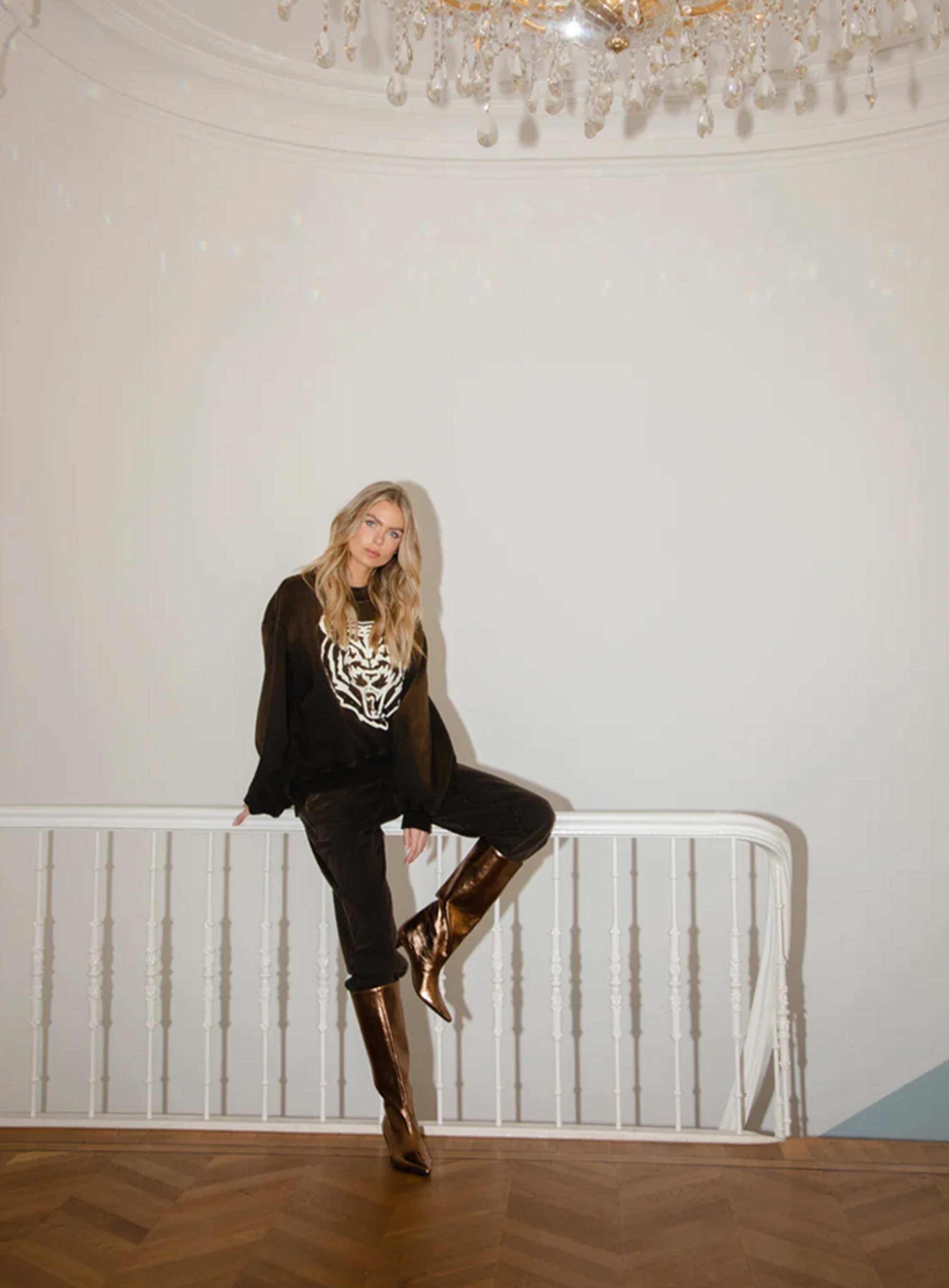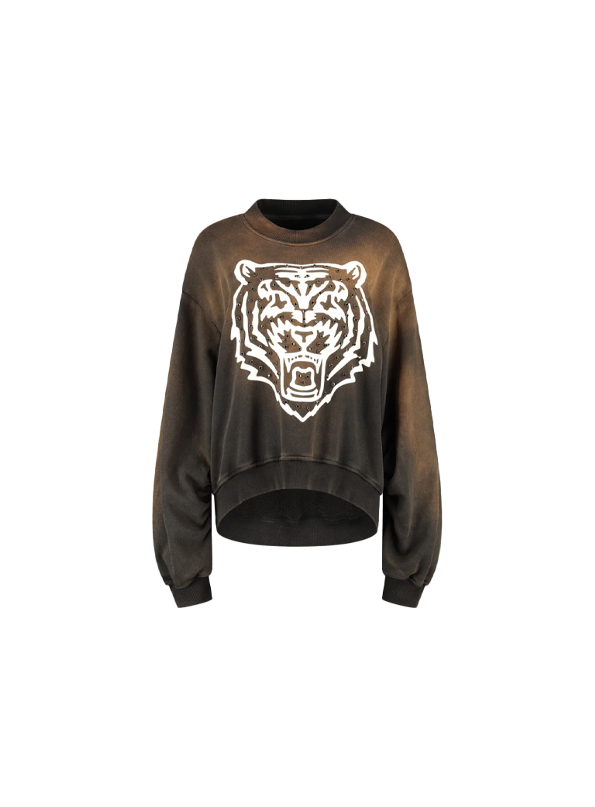 De Tiger sweater van het merk Amaya Amsterdam is een oversized sweater met een grote tiiger op de voorkant gedrukt. Hier en daar een subtiele glitter. Aangesloten halslijn en wat wijder uitlopende mouwen. Het materiaal is 100% katoen, lekker zacht en luchtig.