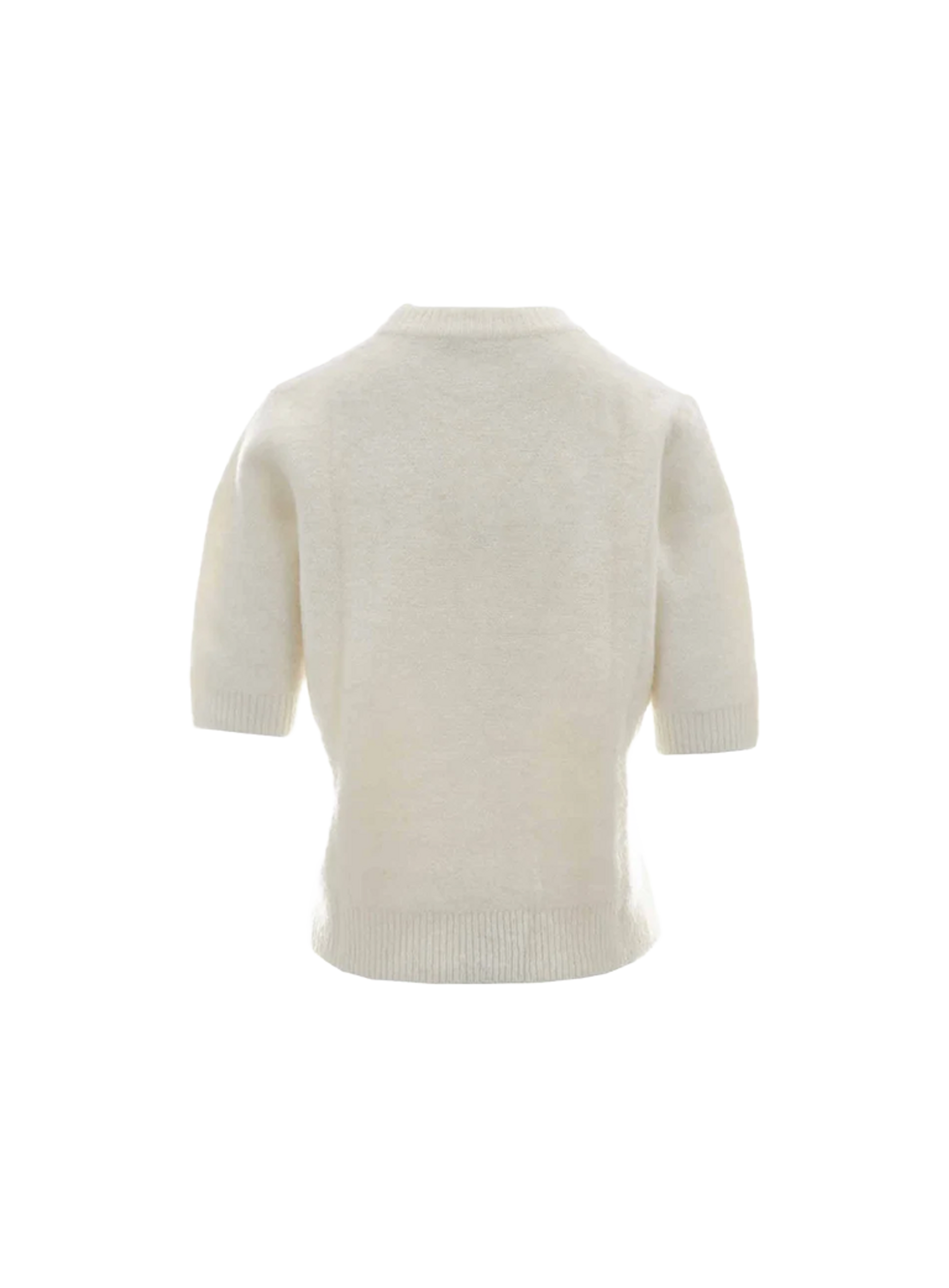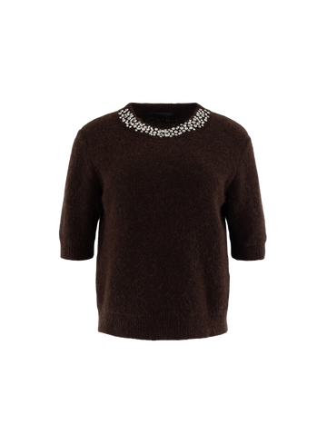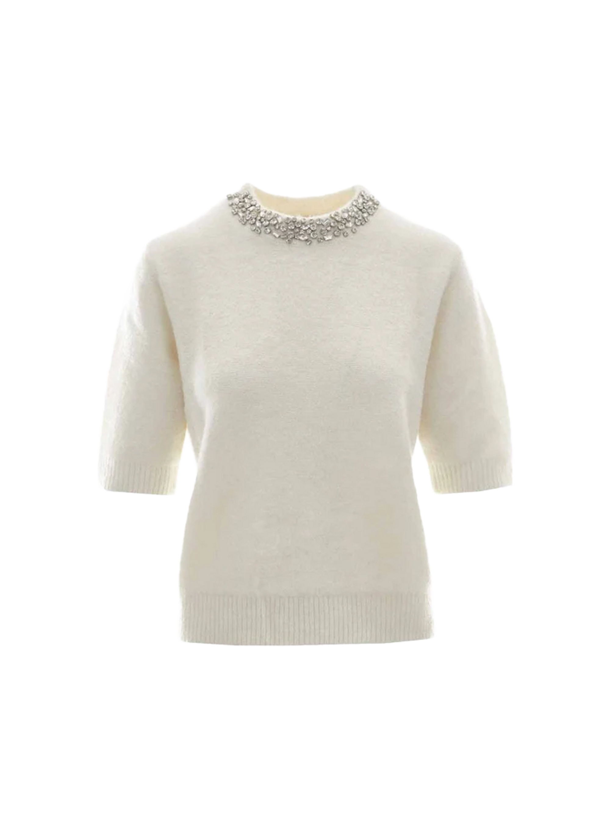 Pullover van het merk Emotions. De top met halflange mouwen heeft een hals afgewerkt met glitter details.