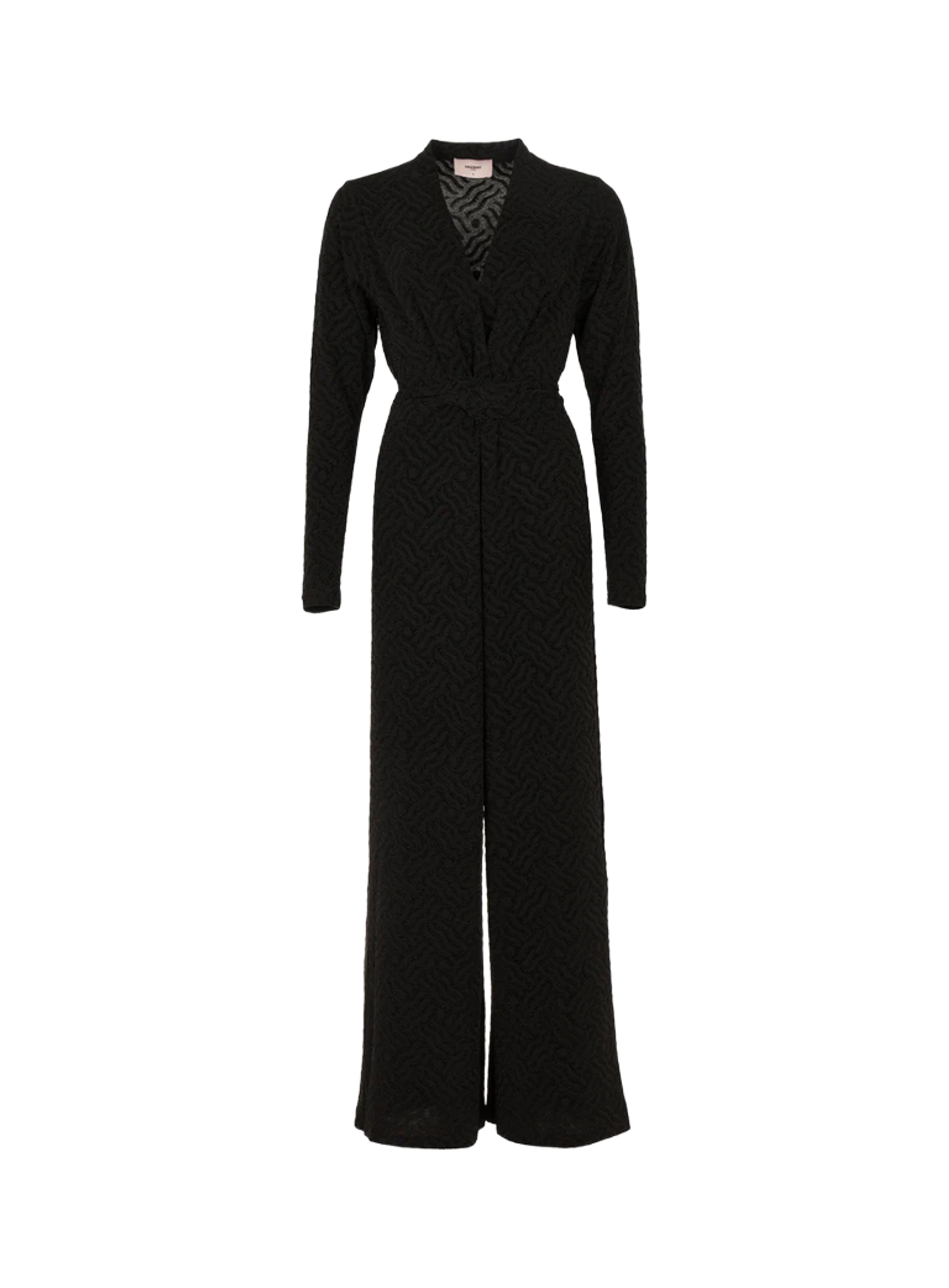 Een elegante jumpsuit van het merk Freebird met een verfijnde en feestelijke uitstraling. Deze stijlvolle lange mouwen jumpsuit is gemaakt van een luxe jersey kwaliteit met structuur en een subtiele glitter lurex finish. De stof heeft comfortabele stretch, waardoor de pasvorm mooi aansluit op het lichaam en prettig aanvoelt. De strikceintuur in de taille benadrukt het vrouwelijke silhouet en zorgt voor een flatterend effect. Dankzij de elegante V-hals en wijde pijpen creëert deze feestelijke jumpsuit een moeiteloos chique look — perfect voor een avond uit of speciale gelegenheid.