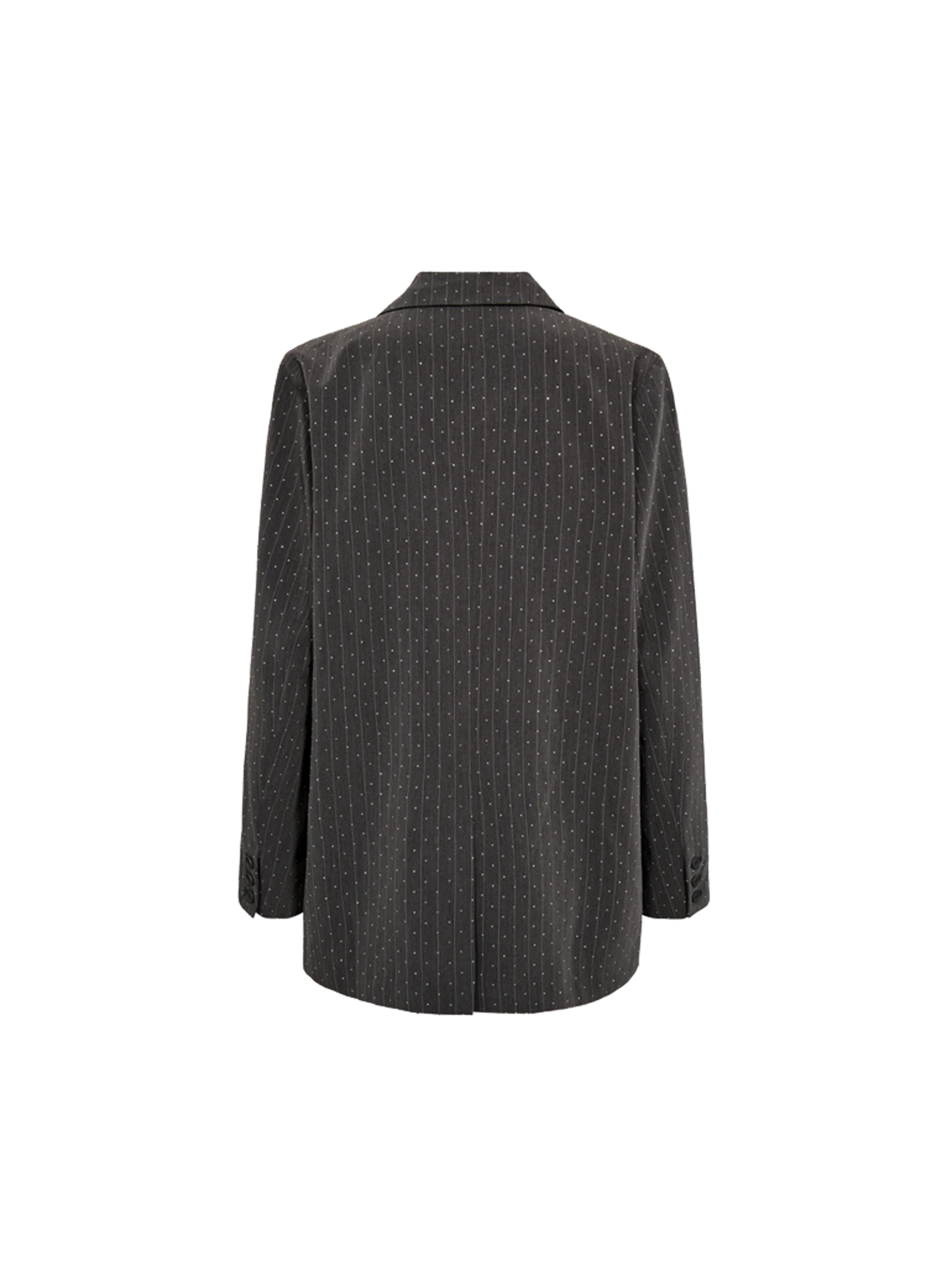 Blazer van Freequent in een zachte stof versierd met kleine strass steentjes en een krijtstreeppatroon. De blazer heeft een eenvoudig silhouet met voering, lange mouwen, een split aan de achterkant, een knoopsluiting aan de voorkant, een V-hals met revers en een losse pasvorm.