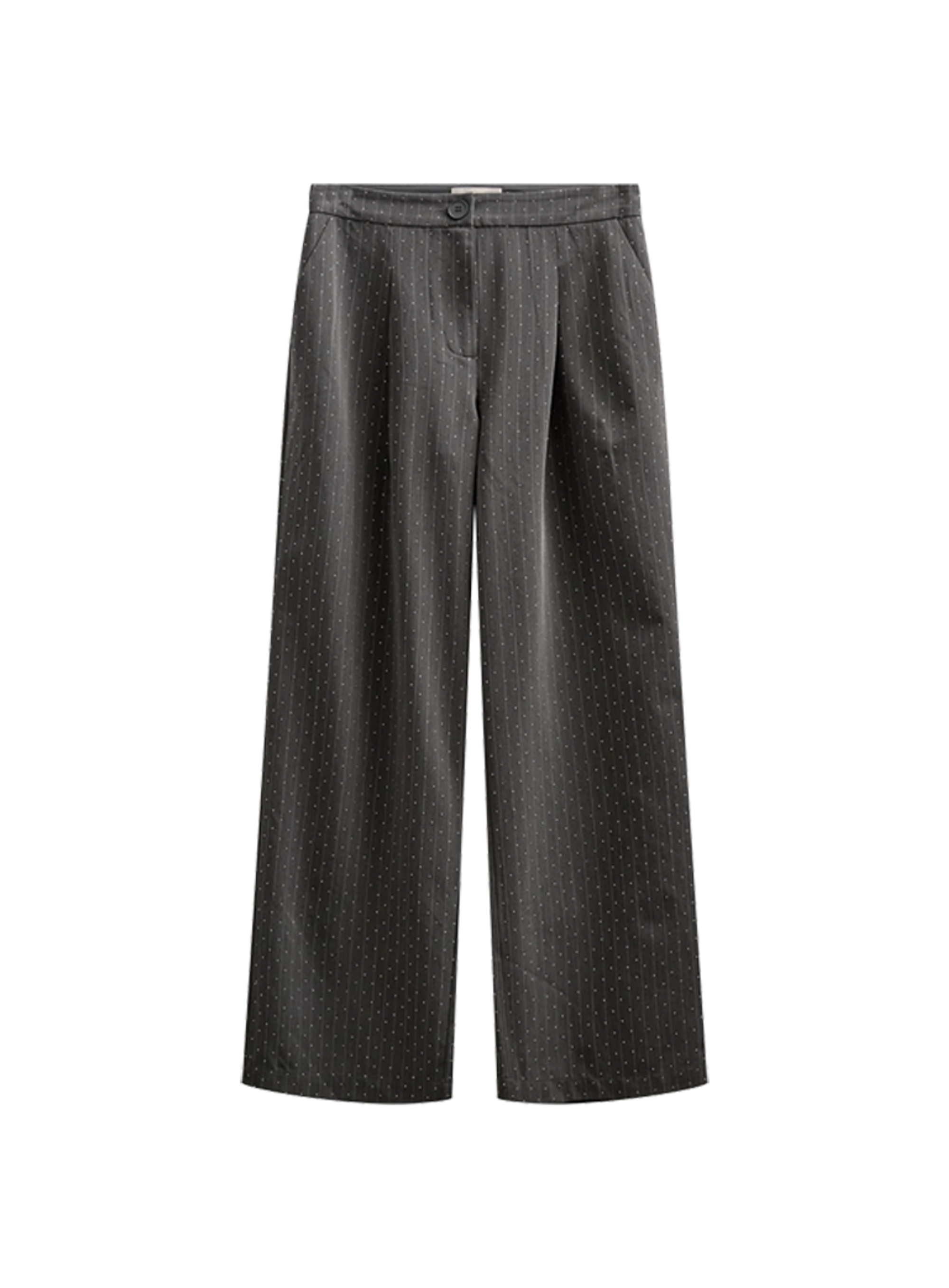 Broek van Freequent in een zachte stof met krijtstreepprint. De broek heeft een hoge taille, een knoop- en ritssluiting en plooien in de lange, wijde pijpen.