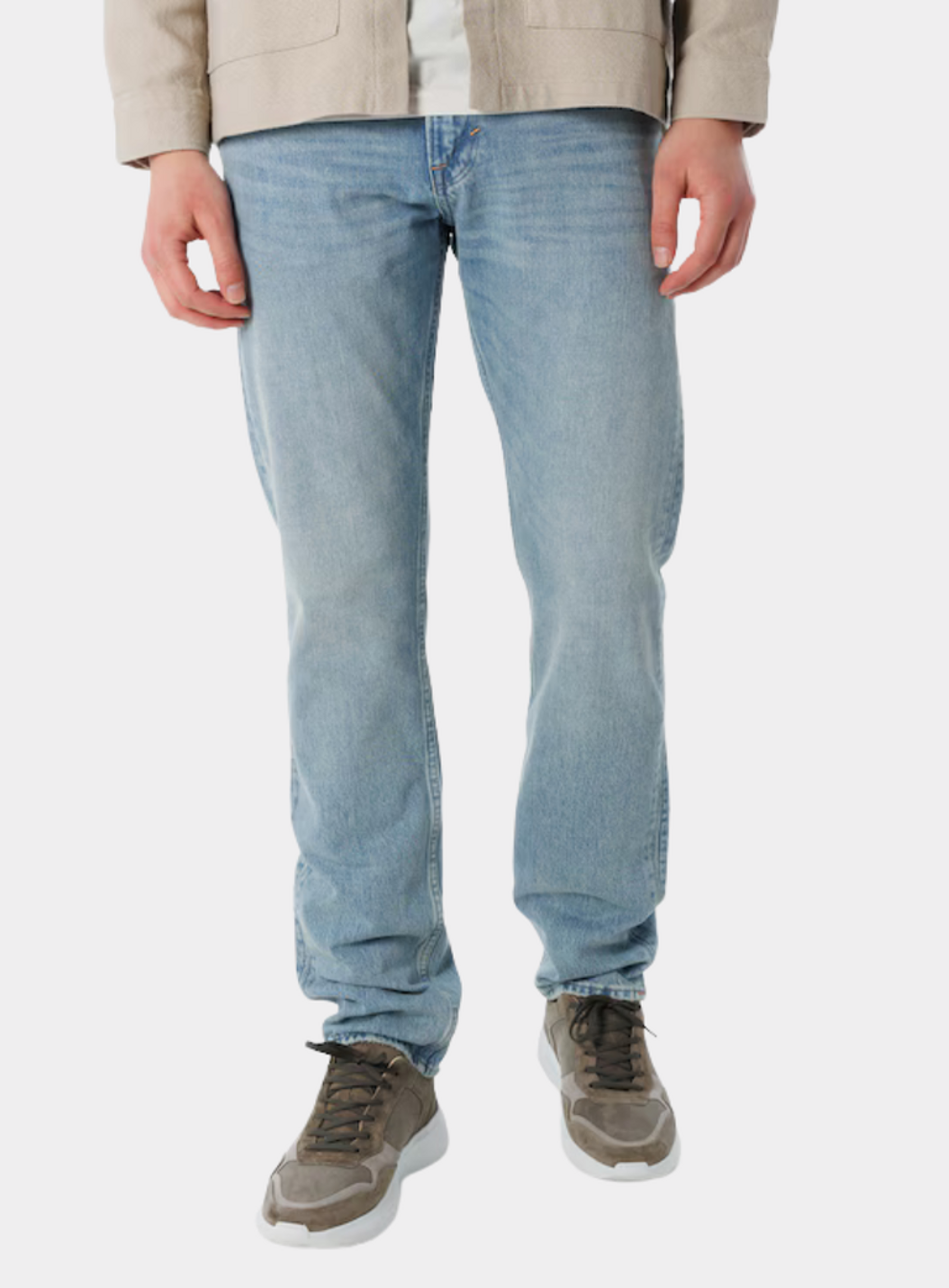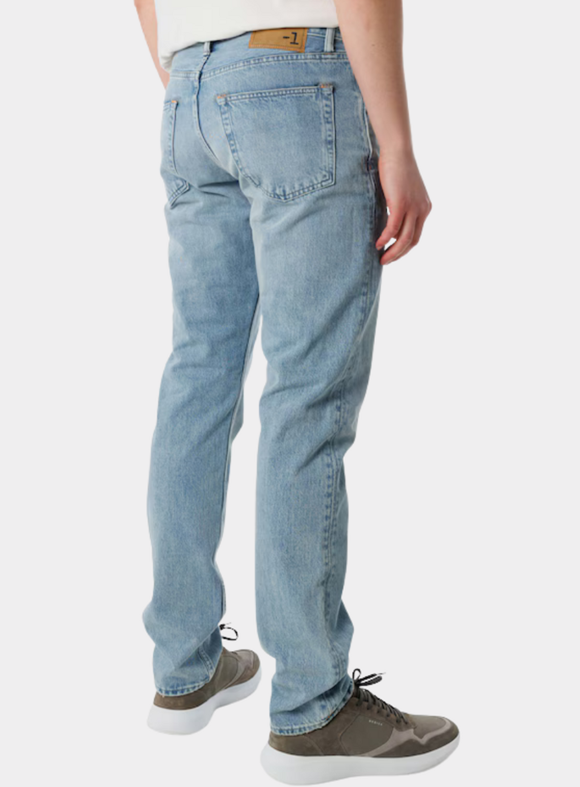 Jeans van het merk Minus One. De broek heeft een rechte, regular pasvorm, wijde voorzakken, knoop- en ritssluiting.