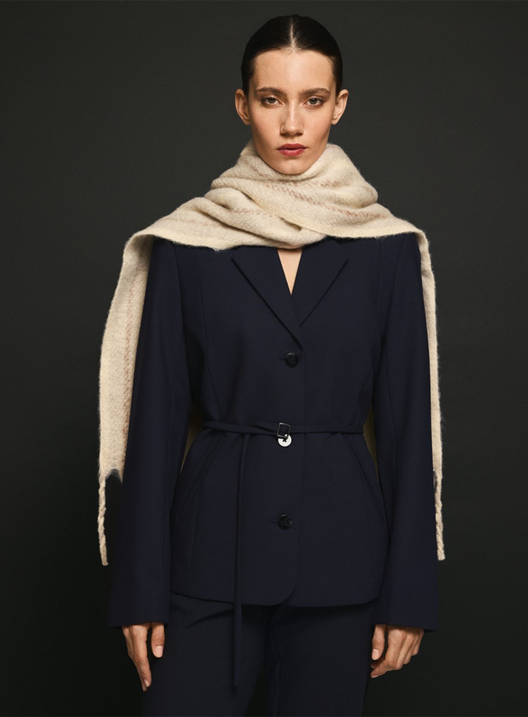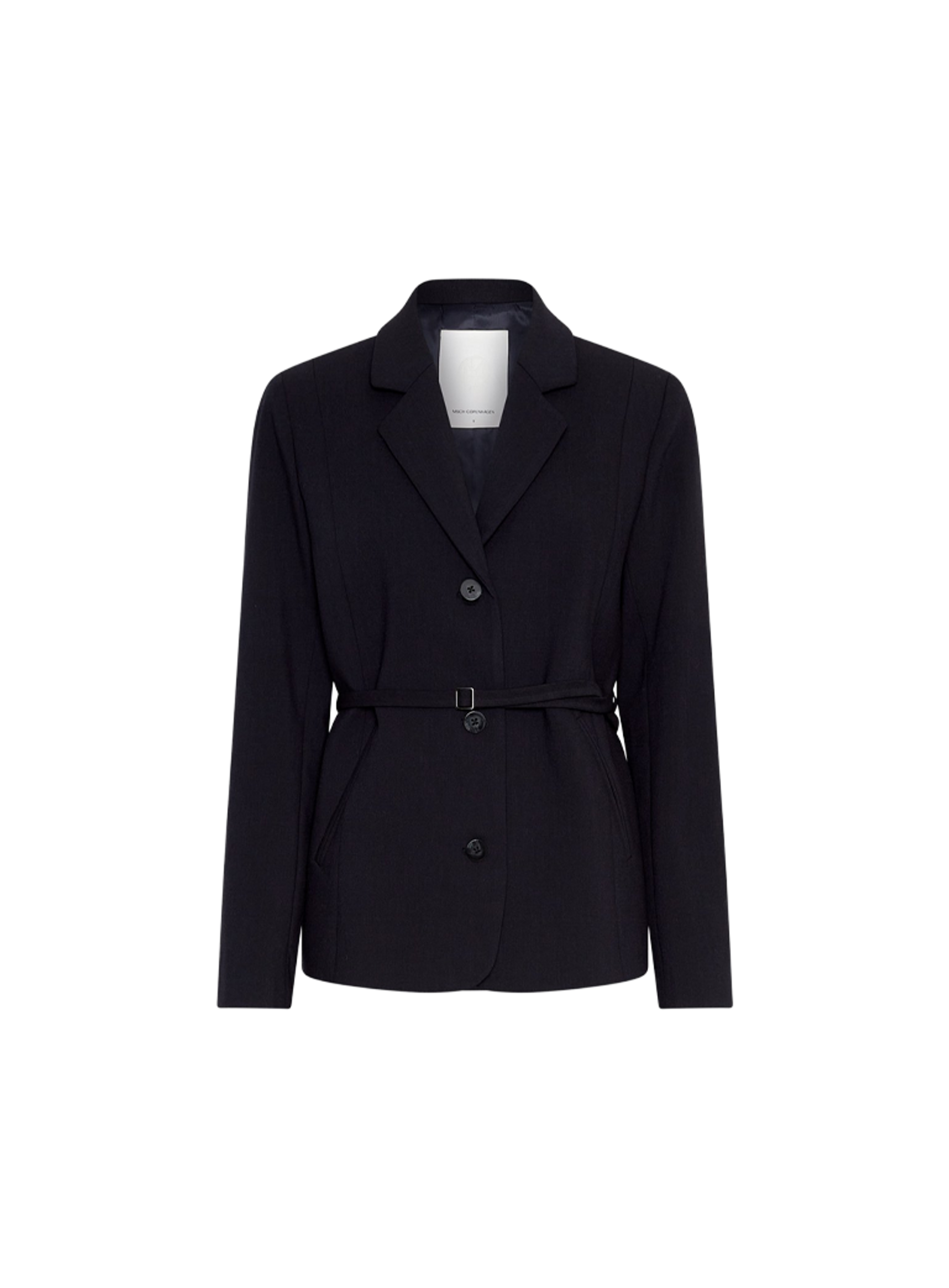 Dit jasje van het merk MSCH Copenhagen heeft een normale pasvorm. Het heeft een enkele rij knopen en een smalle riem om de taille te strikken voor extra maatwerk.