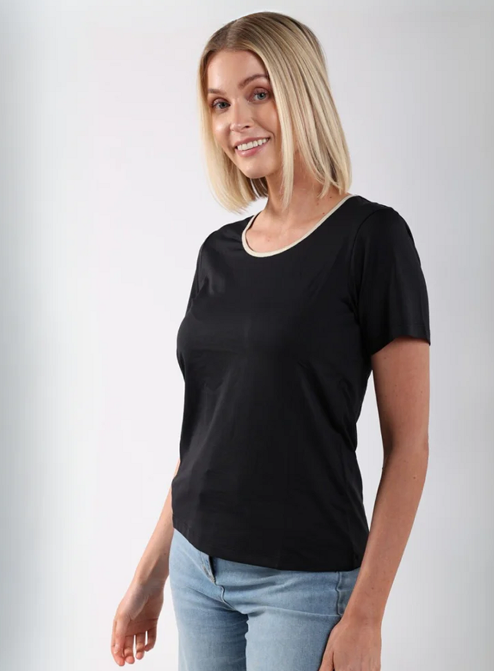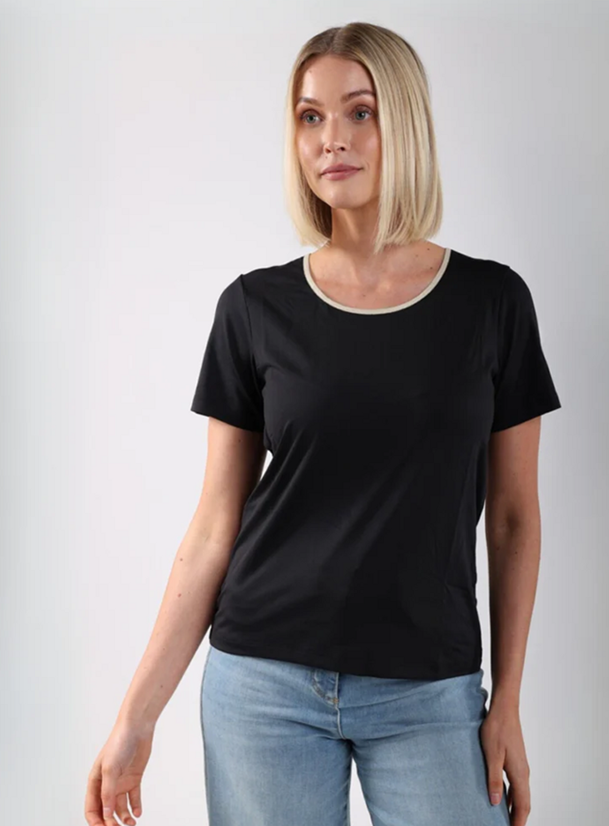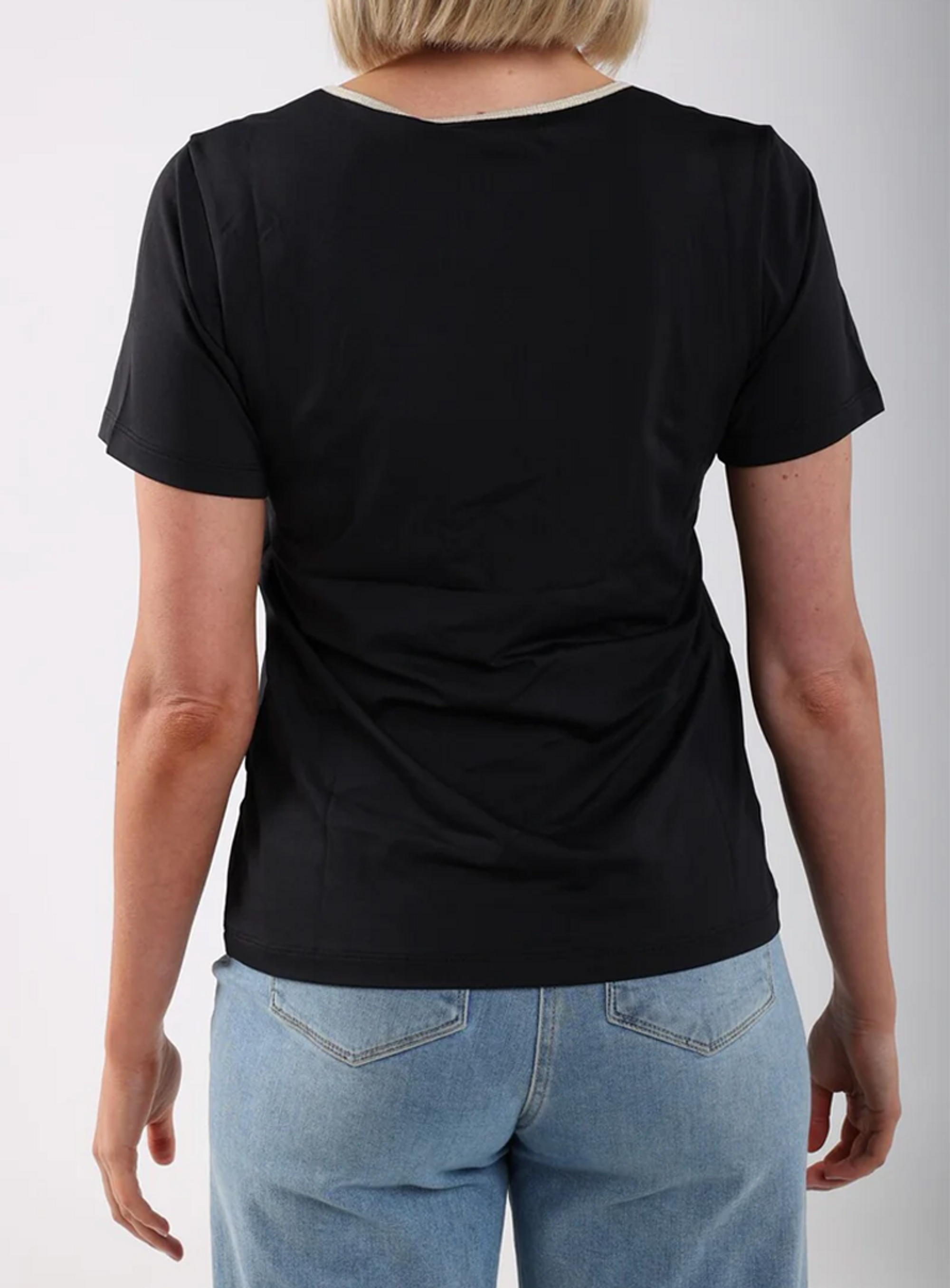 Top Tirza van het merk Nukus. De Tirza top heeft een ronde hals met een subtiel goud lurex randje. Verder heeft de top een aangesloten pasvorm en is de top gemaakt van polyamide en elastaan. Vanwege deze ”travel” kwaliteit is het een zeer comfortabel item om te dragen.