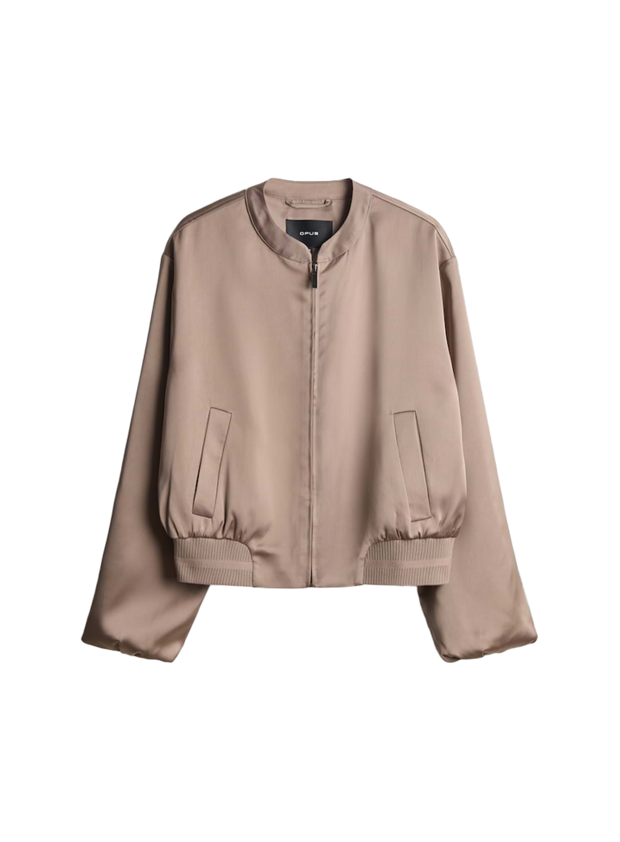 Jacket van het merk Opus. Het jasje is gemaakt van een glanzende satijnen stof, en heeft ritssluiting.