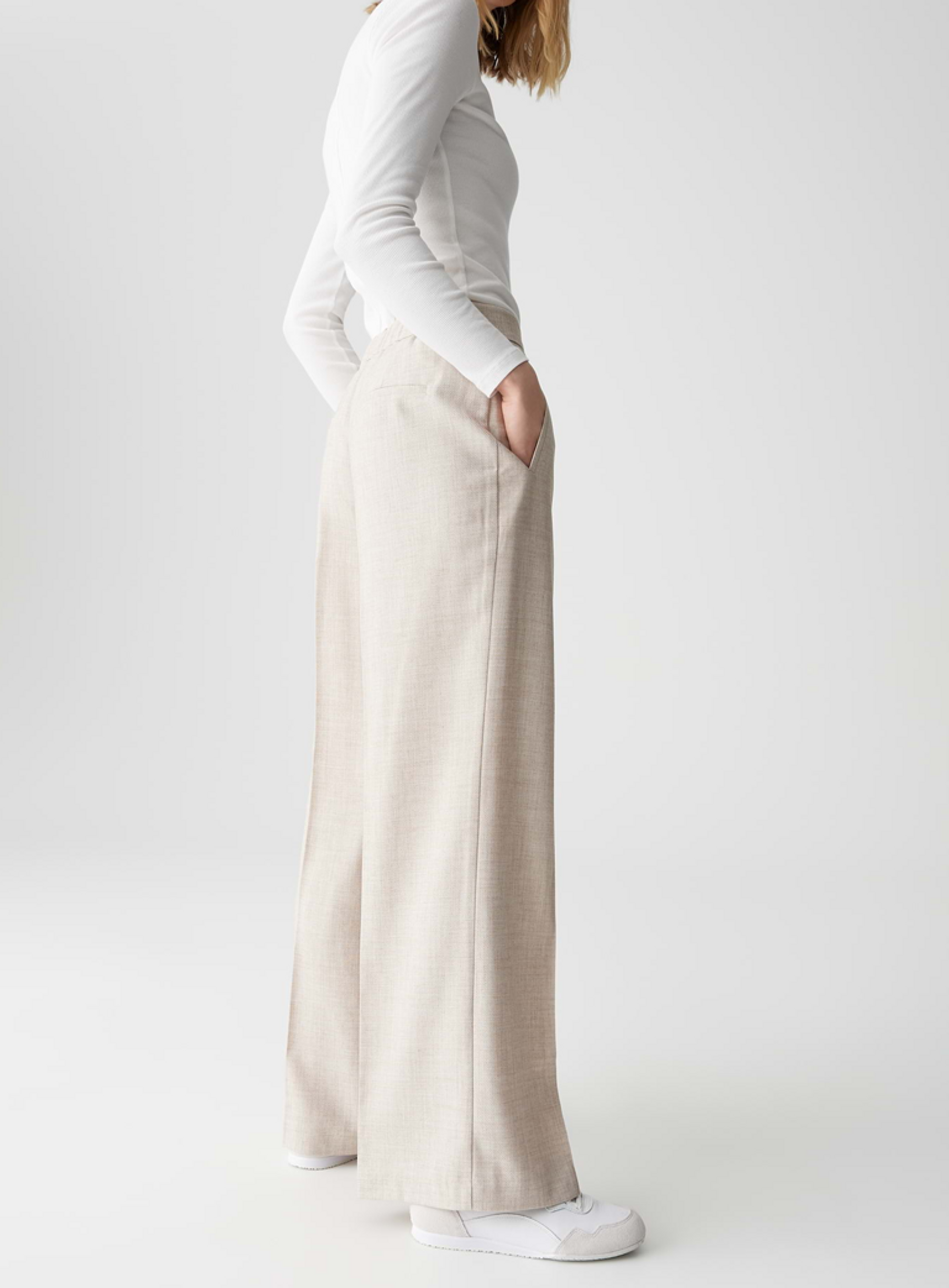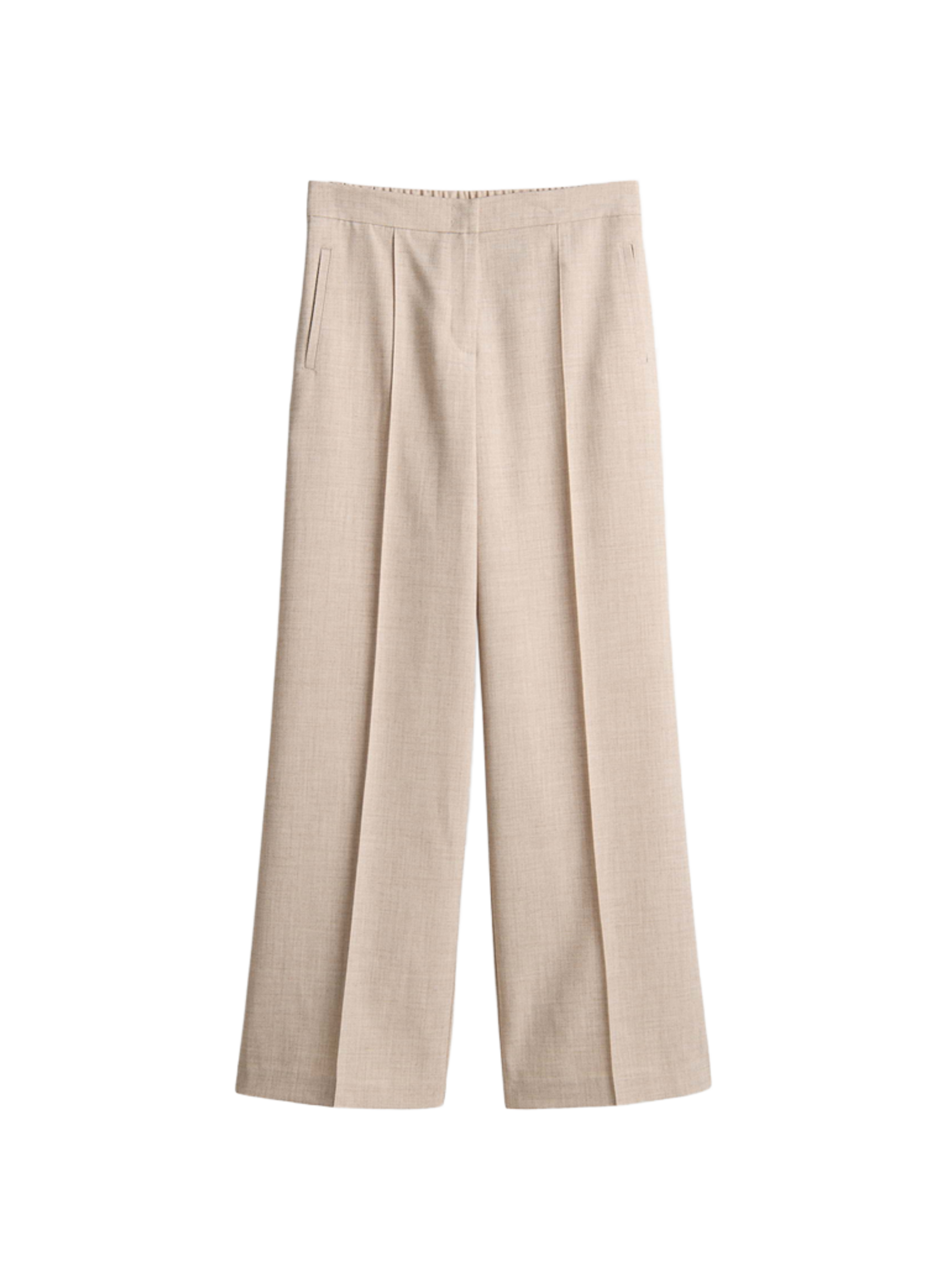 Deze Marlene-broek van het merk Opus valt op door zijn lange, wijde pijpen en opvallende vouwen die het silhouet optisch verlengen. Ontworpen in een fijne gemêleerde look, is het een zakelijke stijl met een vrouwelijke uitstraling.
