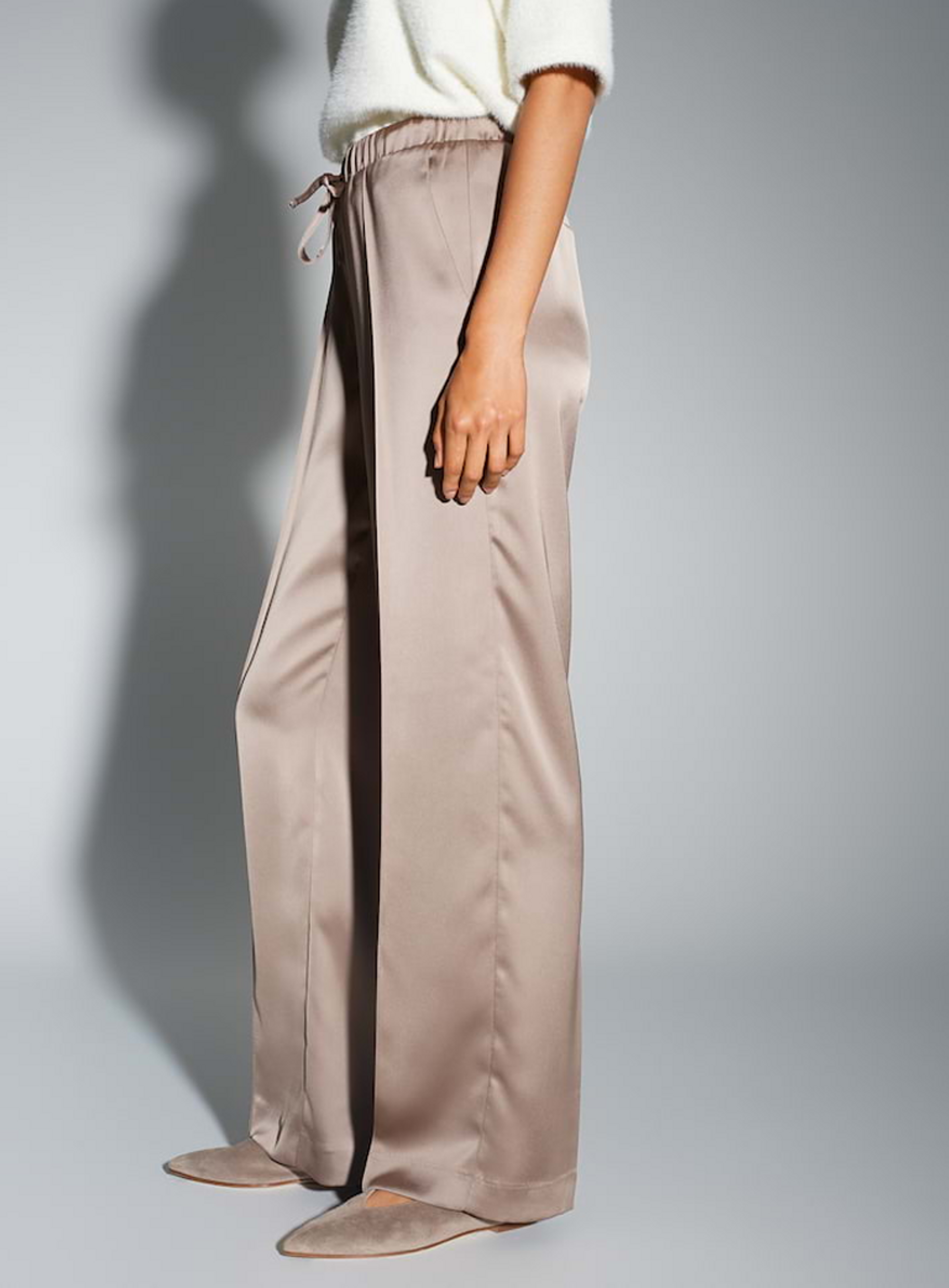 Pantalon van het merk Opus. De vloeiende, wijde pijpen en het glinsterende satijnen oppervlak maken van deze broek een echte blikvanger.