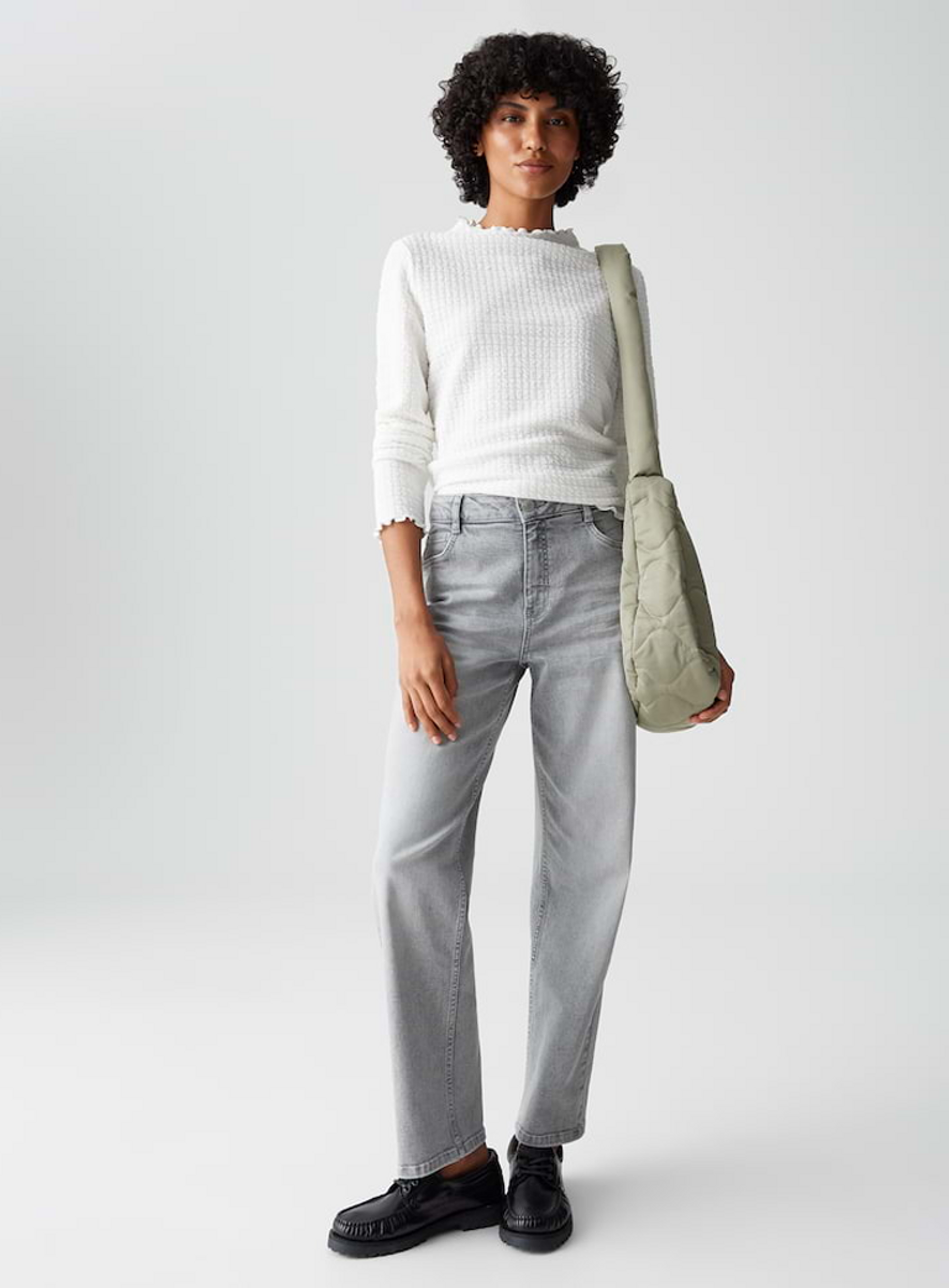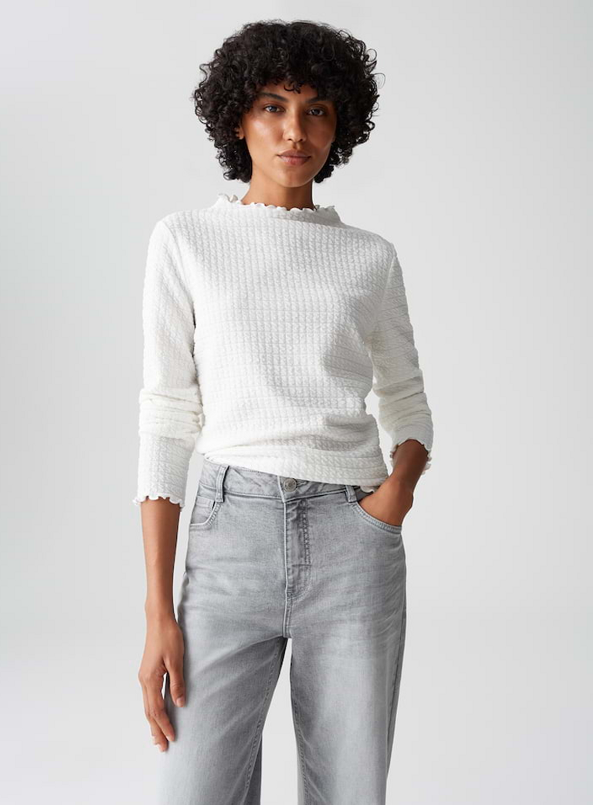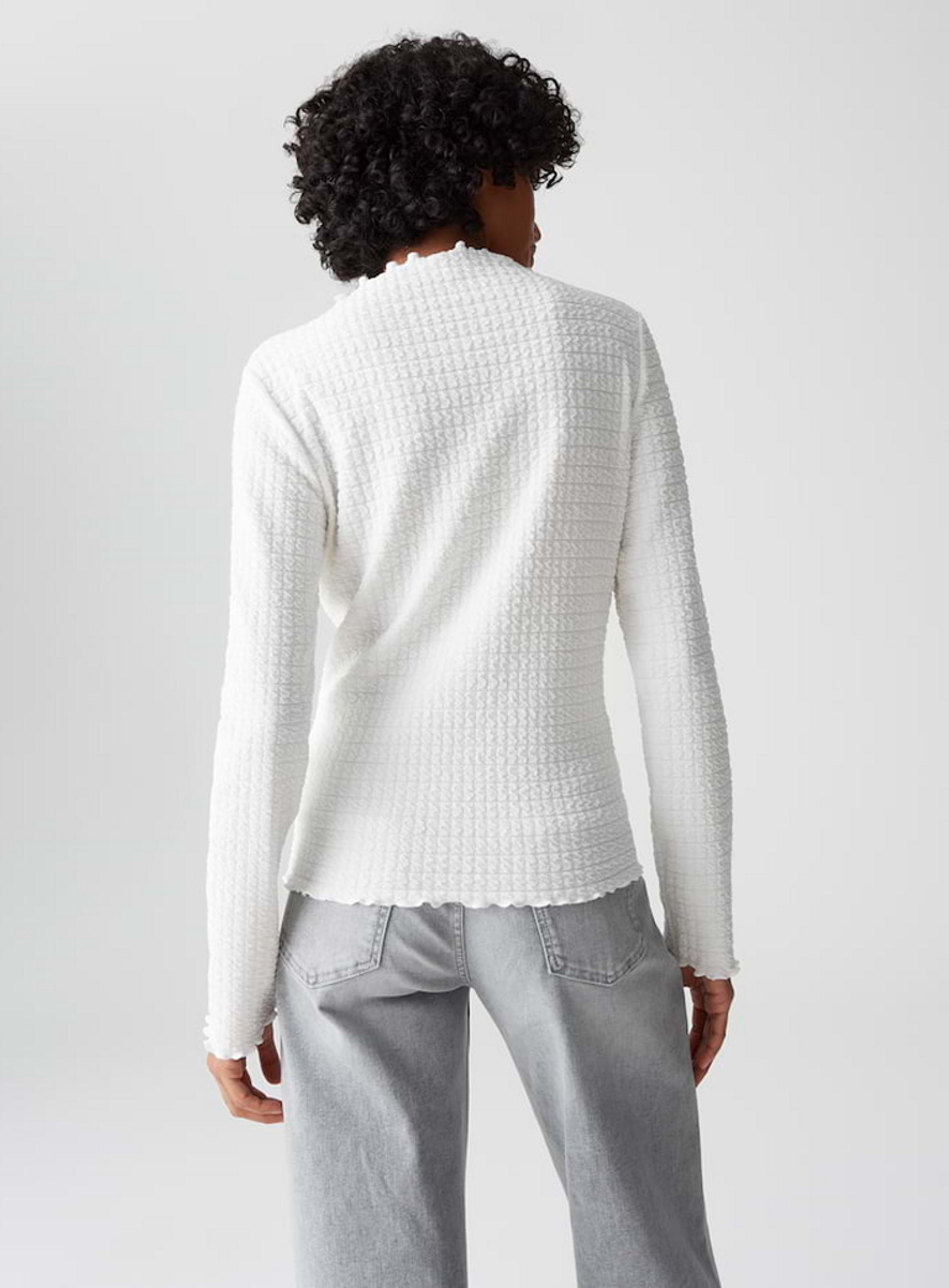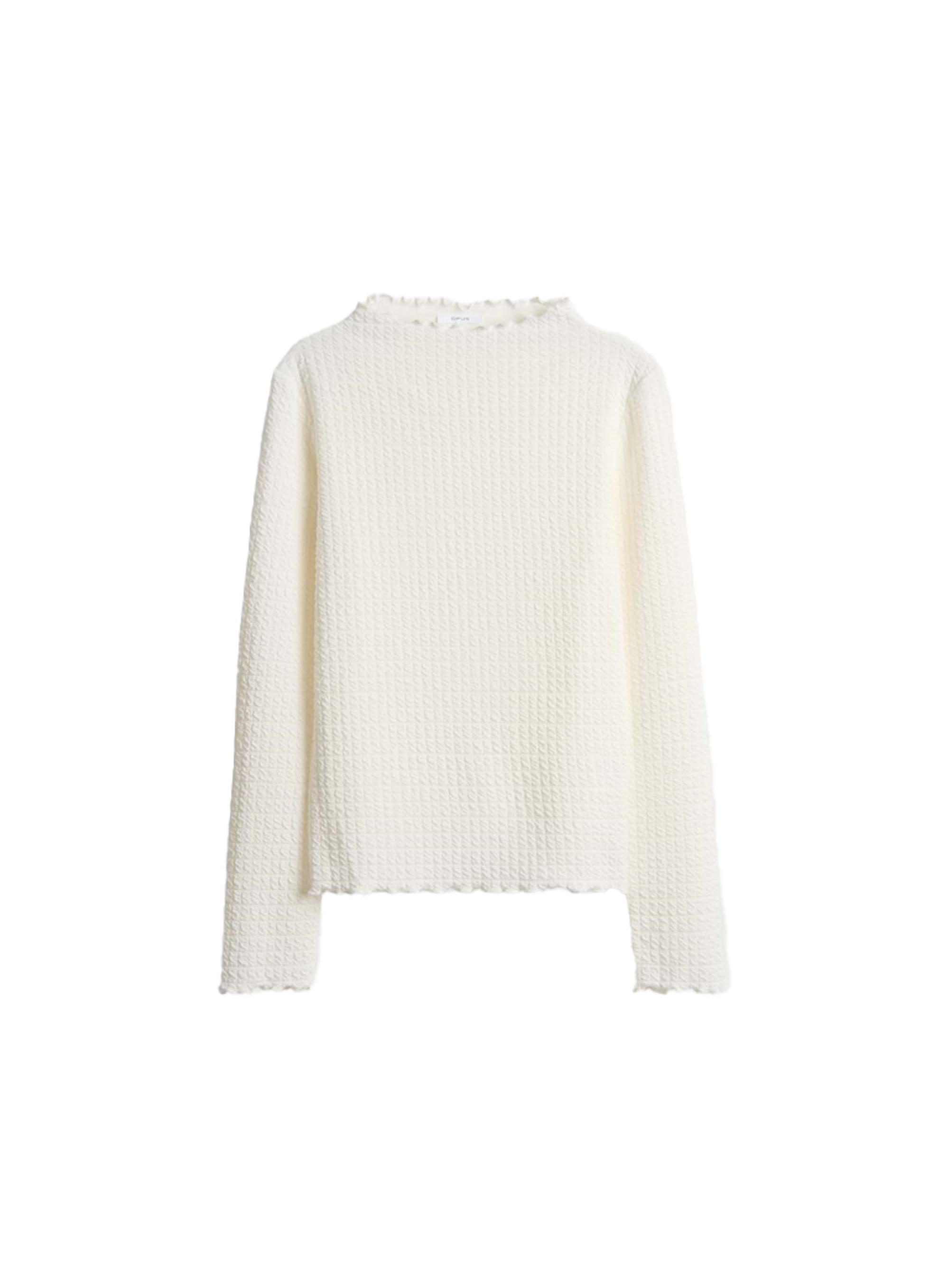 Een fijne driedimensionale structuur en vrouwelijke gekartelde randen kenmerken deze nauwsluitende longsleeve van het merk Opus, die ook een veelzijdige allrounder is om eronder te dragen.