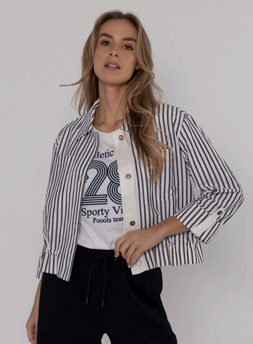 Blouse van het merk Xandres. De blouse met knoopsluiting heeft een streeppatroon aan de voorkant en een rustige achterkant.